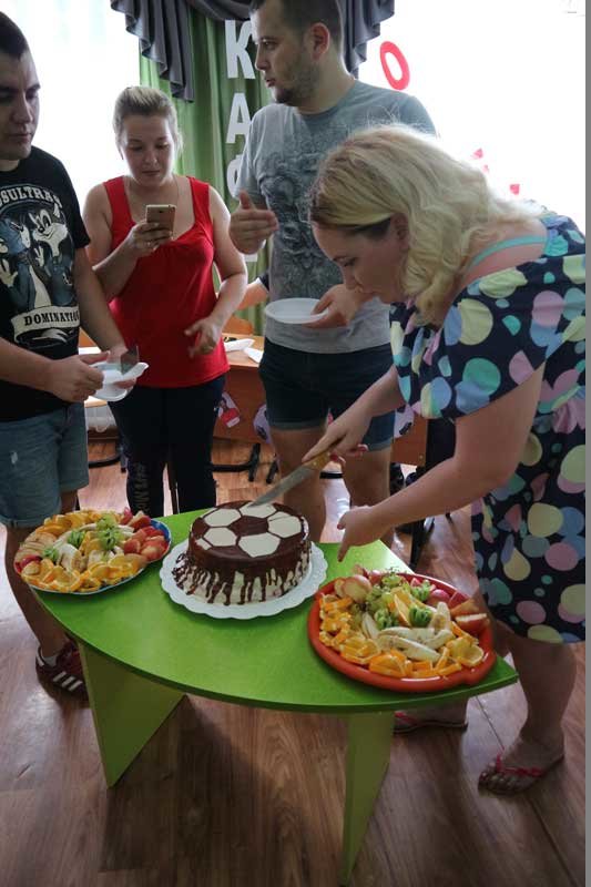 Поздравить воспитанников Собинского социально-реабилитационного центра в День знаний приехали молодые, активные болельщики футбольного клуба «Спартак». День выдался на славу, праздничное настроение у детей, радость встречи – все это способствовало интересному и увлекательному мероприятию. В этот день все было посвящено футболу. В учреждении прошла футбольная вечеринка. Разбившись на 2 команды: ребята вместе с юношами и девушками показали мастерство в ведении мяча, прыгали в мешках, забивали пенальти, отгадывали удивительную викторину о футболе. А затем всех ждал большой сюрприз. В этот необычный день, каждый участник футбольной вечеринки имел возможность только один день посетить кафе «Оле! Оле!» и отведать футбольное меню, где главным было блюдо от шеф-повара. Это оказался торт в виде футбольного мяча. Футбольная вечеринка прошла на славу.