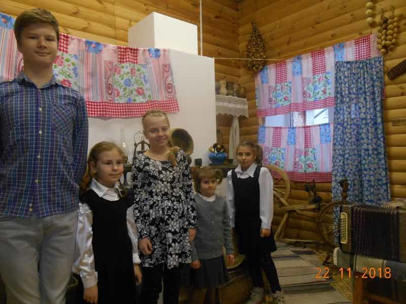 Дети познакомились с русской избой и предметами русского быта, ведь современные дети не знают, как жили их прабабушки и прадедушки во времена, когда не было компьютеров, телевизоров, телефонов и прочих предметов, упрощающих современную жизнь. На протяжении всей экскурсии интерес ребят не угасал. Дети гладили белье, как их прабабушки, сравнивали утюги разных времен, попробовали сбить масло и потолочь в ступе зерно, а также задавали множество вопросов по русскому быту, так заинтересовавшему их.